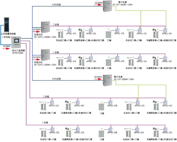 AFRD100防火門(mén)監(jiān)控系統(tǒng)采用AFRD100/B防火門(mén)監(jiān)控器(主機(jī))+區(qū)域分機(jī)+防火門(mén)監(jiān)控模塊三層結(jié)構(gòu)組網(wǎng)模式,適用范圍廣,滿(mǎn)足各種環(huán)境現(xiàn)場(chǎng),便于區(qū)域化管理,監(jiān)控模塊與監(jiān)控器之間采用二總線通訊,監(jiān)控器與分機(jī)之間采用CAN總線通訊,滿(mǎn)足了通訊實(shí)時(shí)性高的要求。
