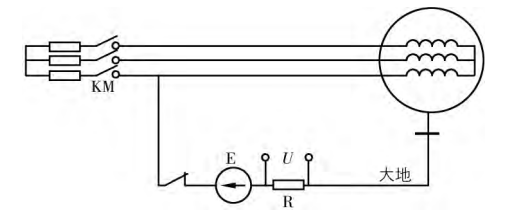 漏電閉鎖同樣是一種重要的漏電保護(hù)方法,顧名思義,漏電閉鎖是指當(dāng)檢測到線路發(fā)生漏電時,需要閉鎖住電閘,防止人員送電之后因漏電而發(fā)生事故。當(dāng)三相系統(tǒng)未通電情況下,通過附加直流電源方法可以檢測到電網(wǎng)對地絕緣電阻阻值的變化,從而判斷是否發(fā)生漏電現(xiàn)象。在三相電網(wǎng)未通電情況下,如圖2所示,接觸器KM主觸點(diǎn)斷開,接觸器KM常閉觸點(diǎn)將附加直流電源接入系統(tǒng),如果發(fā)生漏電,則電壓U發(fā)生變化,從而觸發(fā)漏電保護(hù)電路動作,達(dá)到漏電閉鎖保護(hù)的目的。