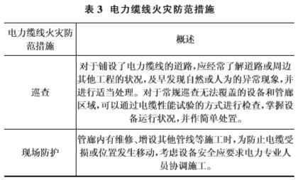 ⑥電力纜線在施工時(shí)采用明火引起的火災(zāi)。通過對(duì)綜合管廊電力纜線火災(zāi)危險(xiǎn)性的分析,需要對(duì)電力纜線做好維護(hù)與管理工作,防范電力電纜火災(zāi)的發(fā)生,防范措施如表3所示。