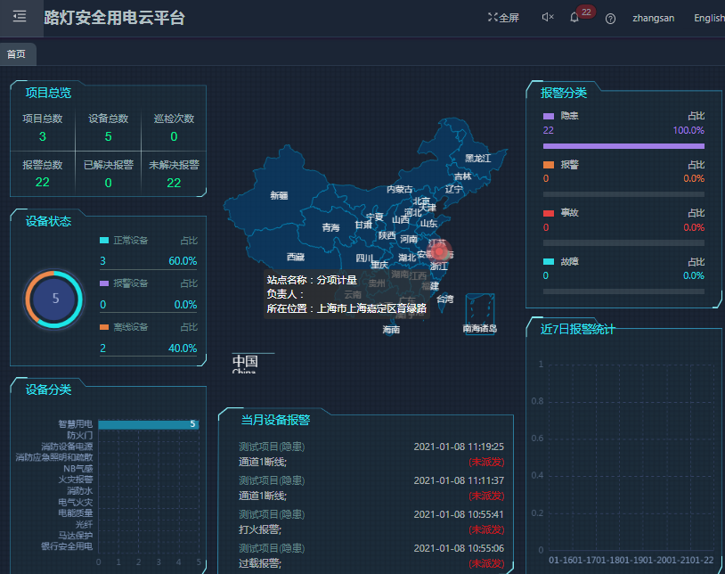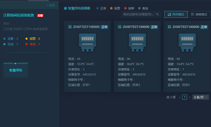 2.監測路燈的電流電壓工作狀態,可以分級設置預警值和報警值,當超出閾值范圍時進行預警和報警,