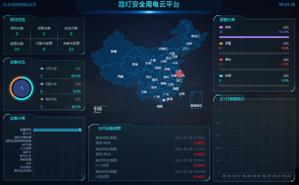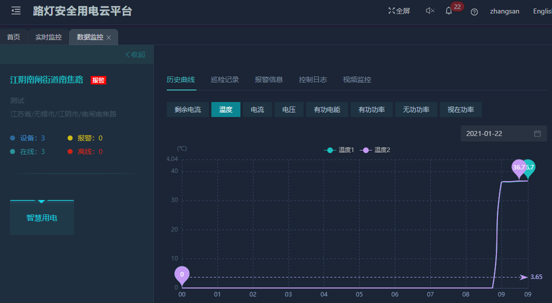 5.對路燈回路的漏電流和導線溫度進行監測,如果漏電過大,線纜溫度過高則進行預警或報警;