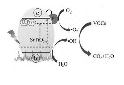 Kong 等分別測試了Pt/SrTiO3-x 催化劑在不同條件下對苯、甲苯和二甲苯的催化性能。其反應機理如圖 5 所示。結果發現光熱催化協同氧化在可見光照明,溫度為±150°C 時,催化劑 Pt/SrTiO3-x 活性和穩定性更高。在初始濃度均為 500ppm時,甲苯的礦化在反應 2 h后可以達到95%以上,苯和二甲苯的礦化在反應時間 4 h后也均超過95%。