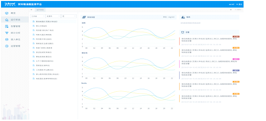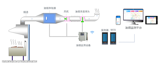 對油煙排污數據的監測,包括油煙排放濃度,顆粒物,NmHc等數值采集監測;同時對監控風機和凈化器的啟停狀態、運行數據進行監測。