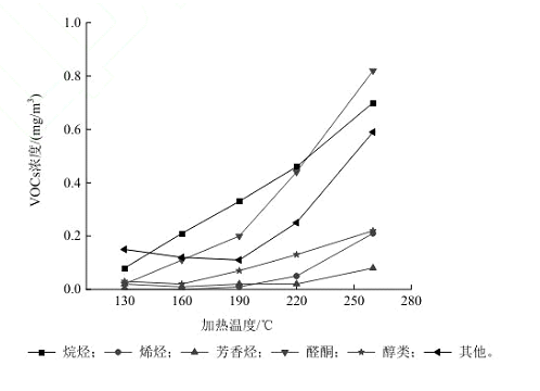 餐飲油煙VOCs的化學成分較為復雜,其化學特性因烹飪風格、烹飪原料、加熱溫度等不同而有很大差異。何萬清等[10]以菜籽油為例,對在不同溫度下加熱產生的油煙VOCs組分進行分析,實驗結果如圖 1 所示。當加熱溫度從130℃上升到260℃時,葵花籽油排放的VOCs的種類和濃度水平都呈上升趨勢。其中,烷烴和醛酮類化合物隨著溫度的升高而升高,且濃度變化范圍較大。