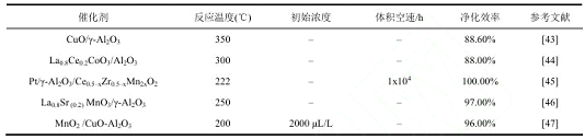 近年來,大量研究集中于通過催化氧化對揮發性有機化合物進行降解。一般來說,在這些過程中使用的兩種基本類型的催化劑:負載貴金屬催化劑和過渡金屬氧化物。貴金屬基催化劑有 Pt、Pd、Au 等,由于其優越的活性和易于再生而得到研究。然而,其應用受到高成本、熱穩定性差等限制。近年來,過渡金屬氧化物催化劑由 Cu、Co、Ce 等元素組成。因具有較高的催化活性和良好的熱穩定性,被認為是貴金屬催化劑的合適替代品。表 3總結了近年來用于催化降解油煙VOCs的金屬催化劑。