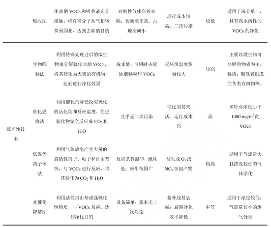 餐飲油煙的凈化主要是針對 VOCs 廢氣的處理。VOCs 控制技術分為回收技術和破壞性技術?;厥占夹g是對污染物進行物理處理,主要包括吸附法、吸收法等;破壞性技術是用化學方法將VOCs氧化分解為CO2 和 H2O 等無污染的物質,主要包括催化燃燒法、低溫等離子體法等。兩種控制技術的工作原理和性能對比如表 1。