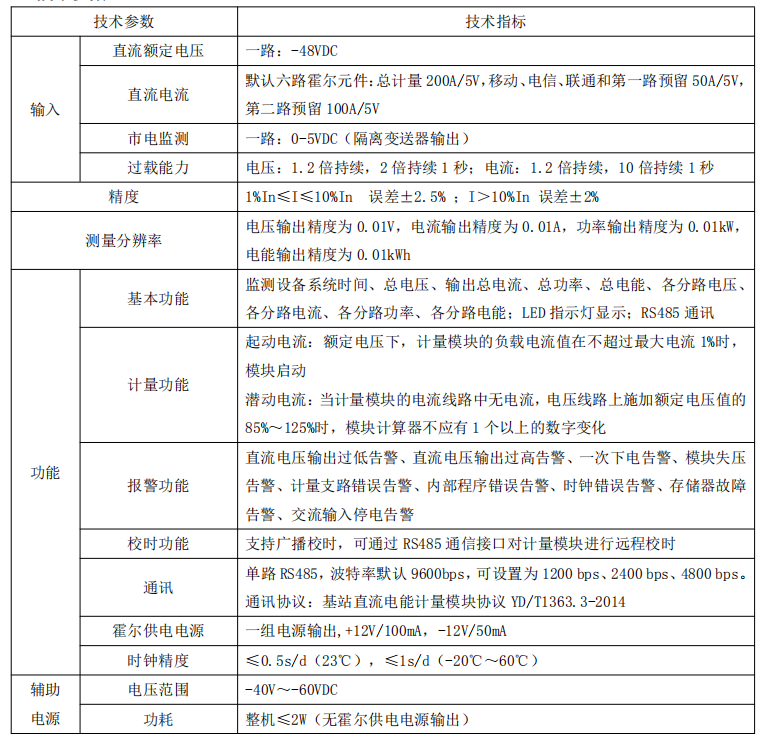 模塊具有工業標準的 RS485 通訊接口采用 YD/T1363.3-2014 規定的通訊協議,符合中國鐵塔有限公司Q/ZTT 2205-2017《基站直流電能計量模塊技術要求》相關技術要求。