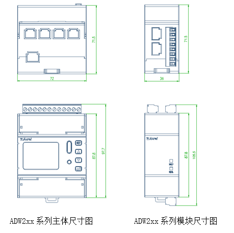 ADW2xx系列導軌式多回路無線計量表主要用于低壓三相回路全電參量測量,同時可選擇四個回路的電流輸入。可直接或間接測量電壓、電流、功率、功率因數、相角、不平衡度、諧波等參數。 還可通過其RJ45接口擴展輔助功能,實現DI、DO、測溫、剩余電流測量,以及2G、4G、LoRa、LoRaWan、NB-Lot無線通信功能。