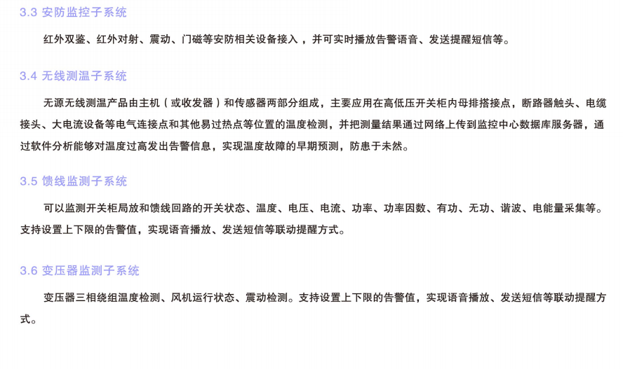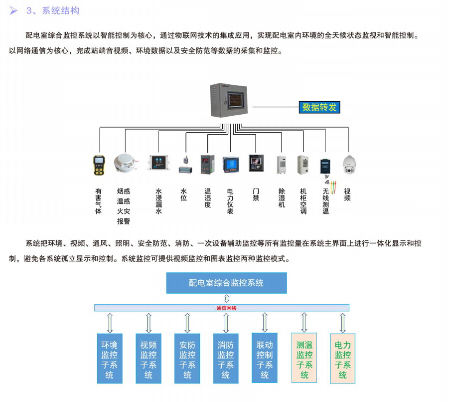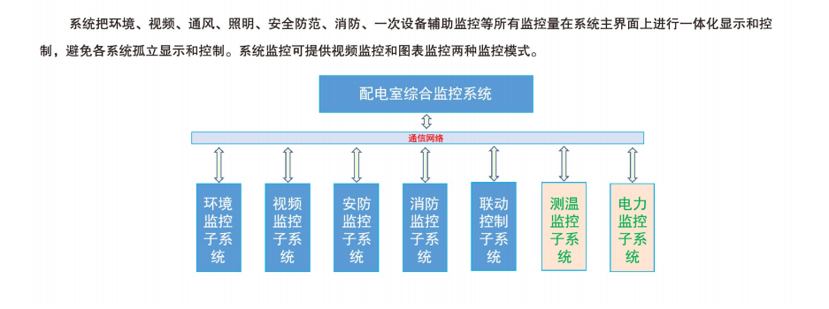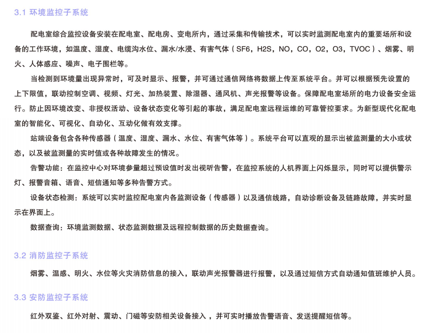 配電室綜合監控是整個電能管理系統中的一個重要環節,一般以低壓網中的配電室環境溫濕度、配電開關狀態、漏水/水浸、煙霧及配電室的防盜為監測對象,對配電房重要設備運行狀態的多種參數和狀態進行本地聯動控制、遠程集中監控、手機短信報警。配電室的全信息采集和監控對配電室自動化運行管理、檢修維護、防災預警、安全防護、電力需求管理等應用具有重大意義。